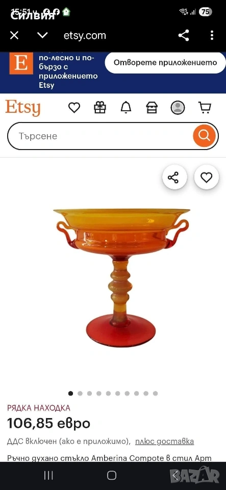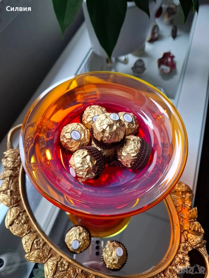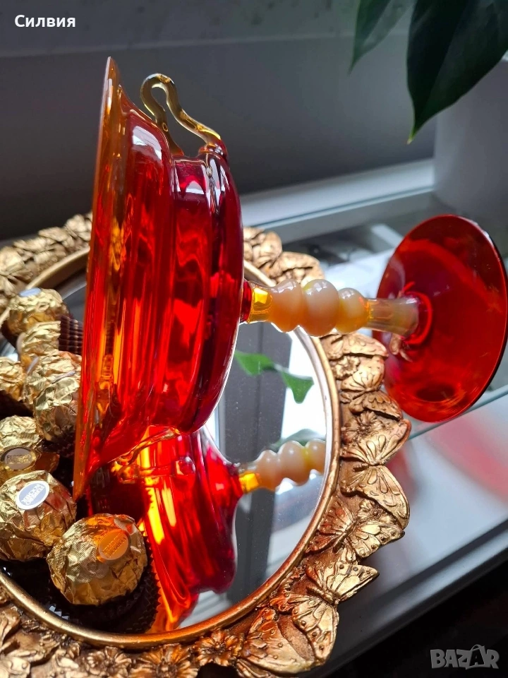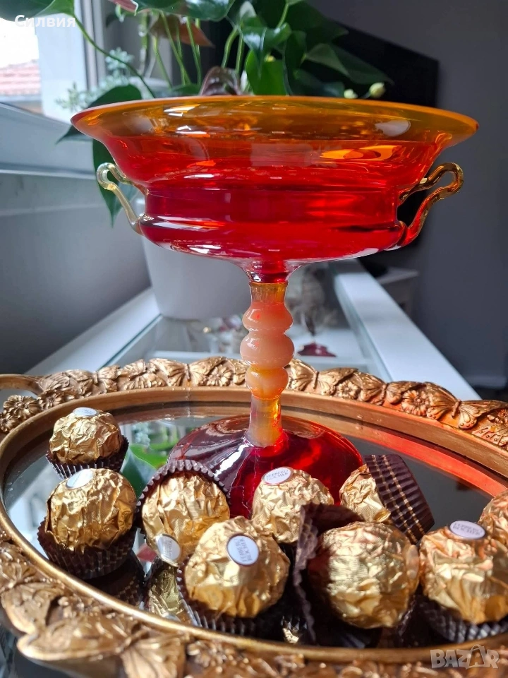 Едно истинско бижу за ценители – изящна купа на столче (бонбониера) от масивно художествено стъкло. Предметът притежава невероятно присъствие и прелива в огнени нюанси на наситено червено и кехлибарено.. Висококачествено рубинено стъкло с изключителен блясък и прозрачност. Уникално столче с опалинов акцент (млечен детайл) и две фини, ръчно изработени стъклени дръжки. Състояние: Отлично съхранено, без чуквания или пукнатини – готов акцент за Вашия интериор. Стил: Антикварен/Винтидж, носещ духа на класическата европейска аристократичност. Тази красива купа не е просто съд, а произведение на изкуството, което улавя светлината по магически начин. Перфектна за декорация на маси от масивно дърво, витрини или като ценен подарък за колекционери. Цена 8️⃣5️⃣€ 166,25лв