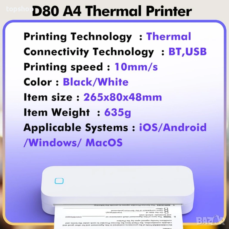 Безжичен: Свързва се чрез Bluetooth с Android и iOS (през приложението NADA Print) или чрез USB кабел към лаптоп/PC.