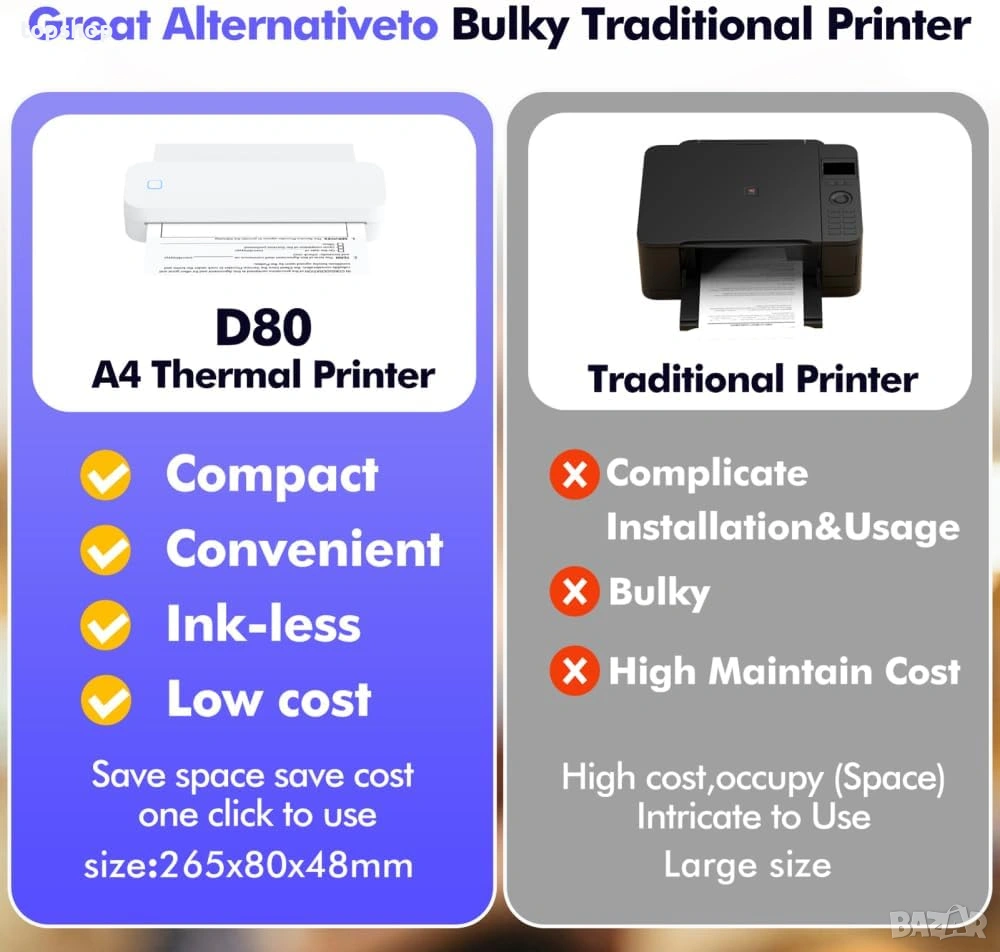 Технология без мастило: Край на касетите и тонерите! Използва директен термален печат – икономично и вечно.