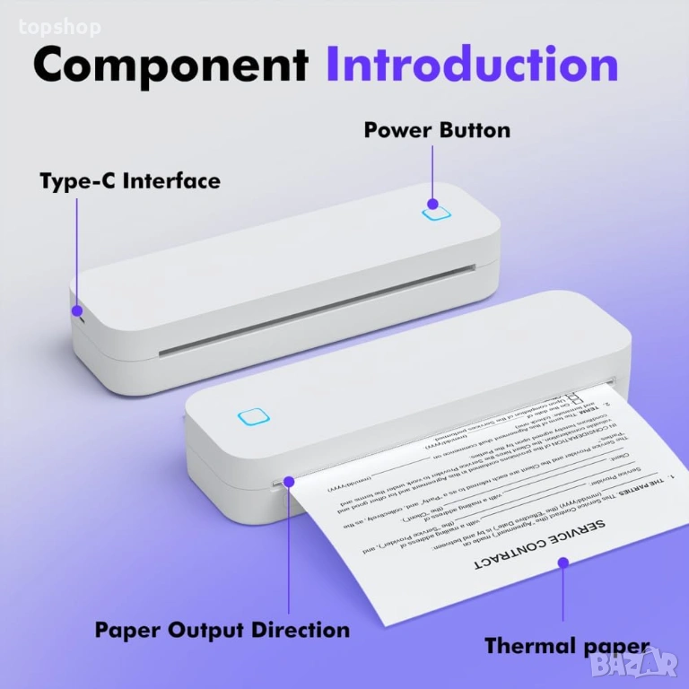 Комплектът включва: Принтер, Type-C кабел за зареждане и инструкции.