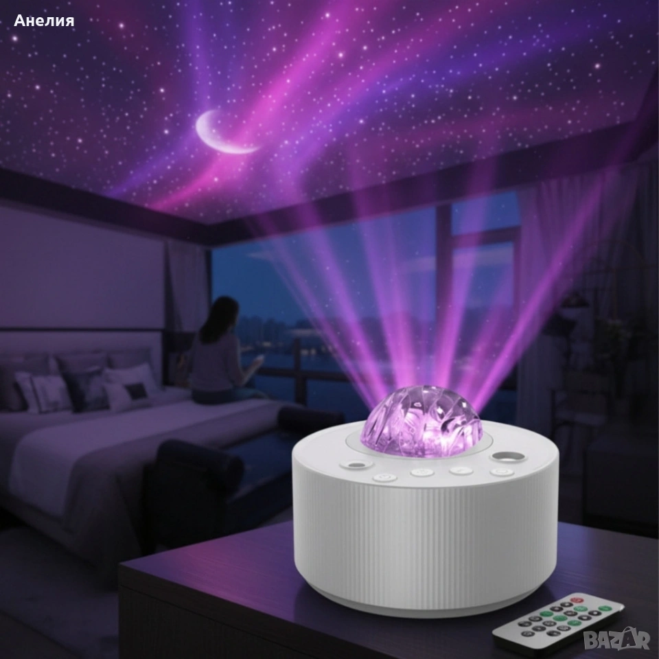Този компактен и стилен проектор съчетава красотата на северното сияние и звездното небе с успокояващ бял шум, за да създаде уникална и релаксираща атмосфера.