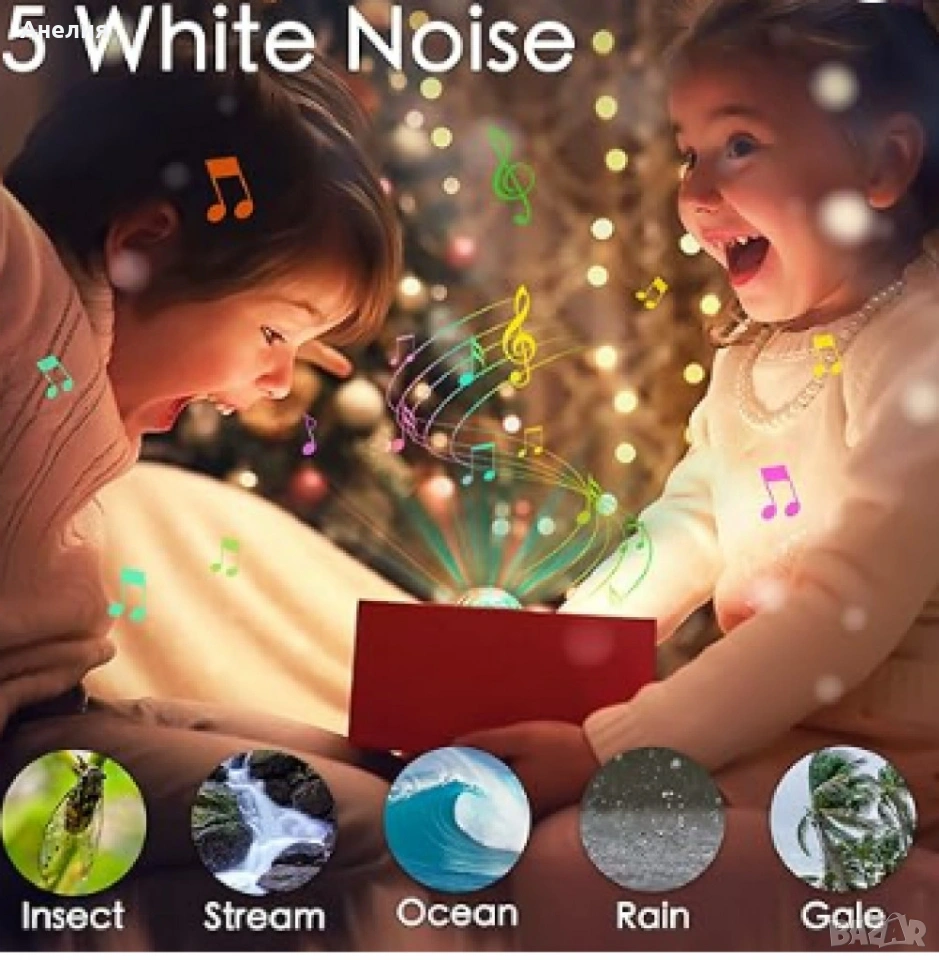 Функции: Прожекционни светлини, включващи релаксиращи природни звуци: Бял шум ,Чуруликане на насекоми и птици, Течаща вода ,Вълни ,Бял шум на вентилатор и гръмотевица.