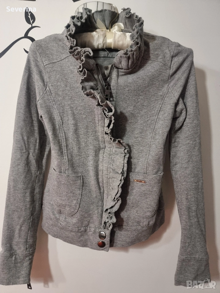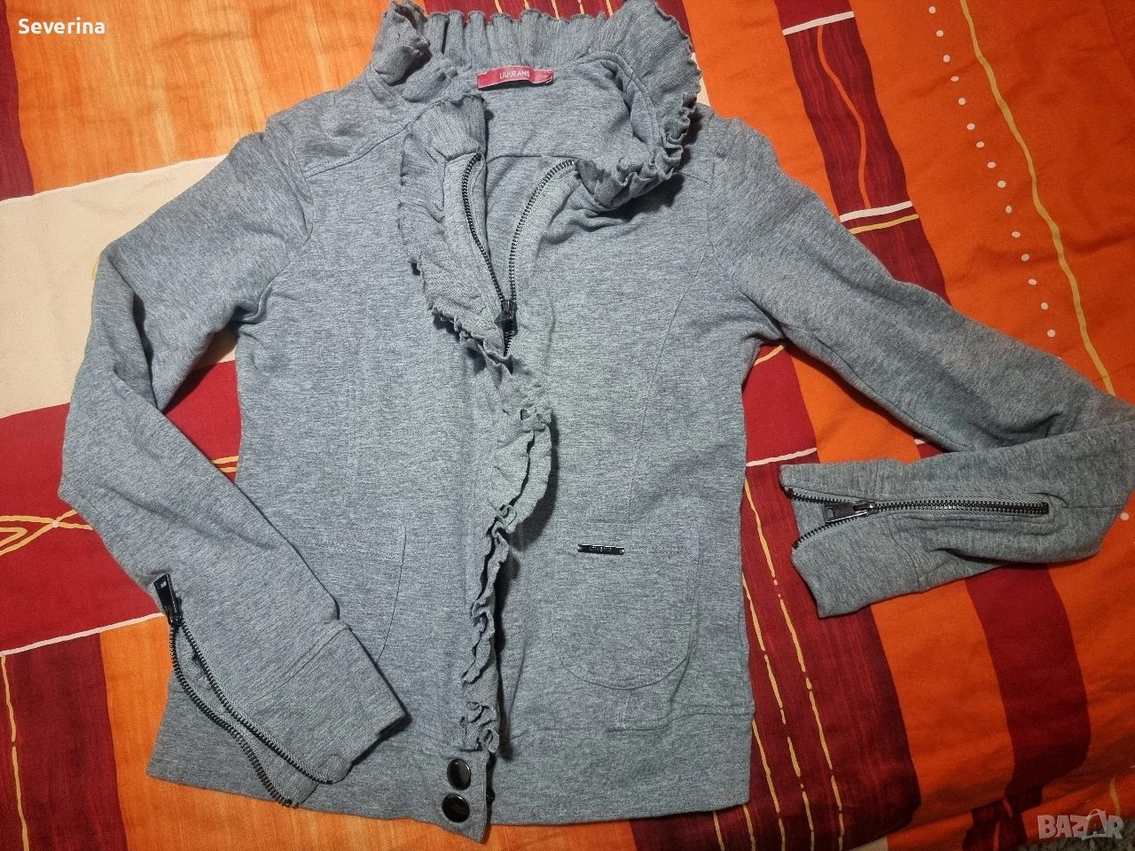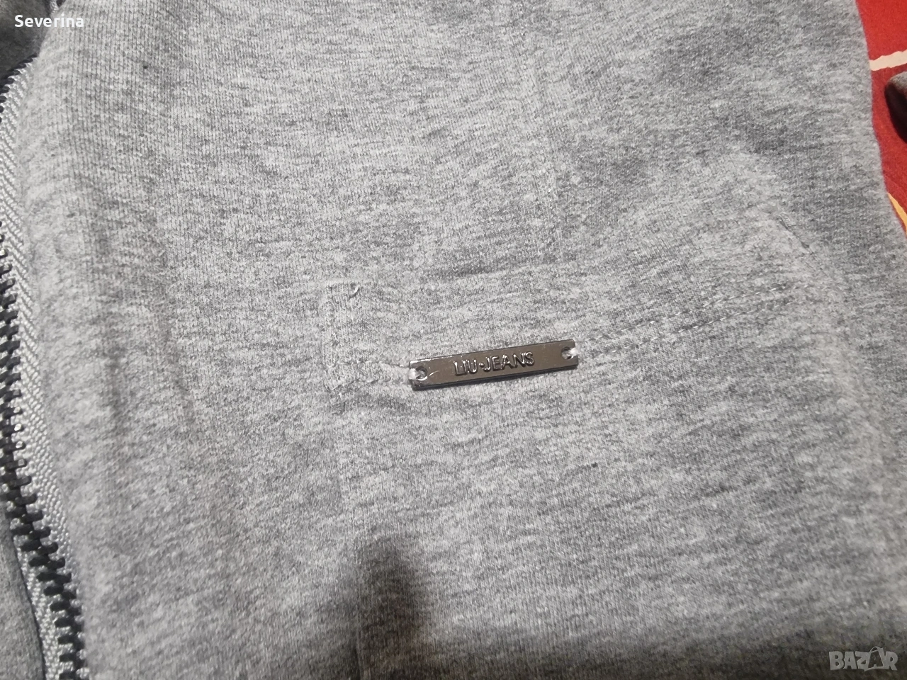 Оригинална жилетка/суичър на Liu jo в перфектно състояние, стои уникално както с дънки, така и с рокли!По етикет е хs размер, но ето точни размери от рамо до рамо 36,от мишница до мишница е 43,от ръб до ръб долу 38,дължина на ръкава 57,дължина на жилетката 53.