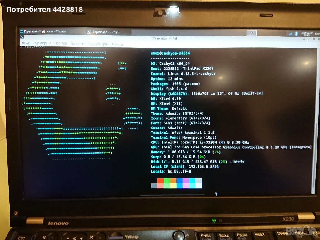 В момента на лаптопа е инсталиран Linux CachyOS базиран на Arch с графична среда XFCE. При желание мога да сменя с всяка друга ОС.