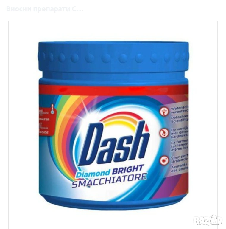 Ефективност и резултати: С редовната употреба на Dash Diamond Bright Smacchiatore Colorati, вашите цветни дрехи ще бъдат винаги чисти и защитени, благодарение на мощната формула, която премахва всички замърсявания, без да уврежда тъканите.