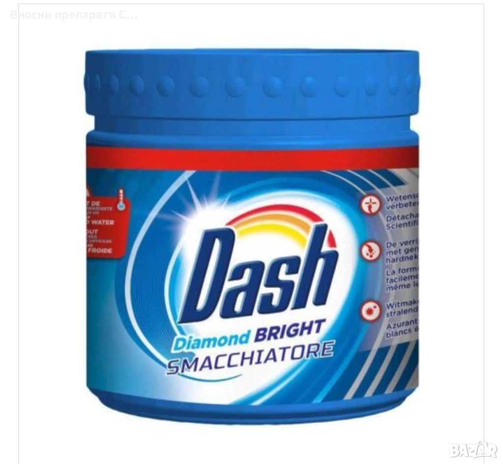 #Dash #Diamond #Bright #Smacchiatore #Bianchi е мощен препарат за премахване на петна, специално създаден за бели тъкани. Този продукт осигурява ефективно отстраняване на дори най-упоритите петна, като оставя дрехите ви безупречно чисти и свежи.