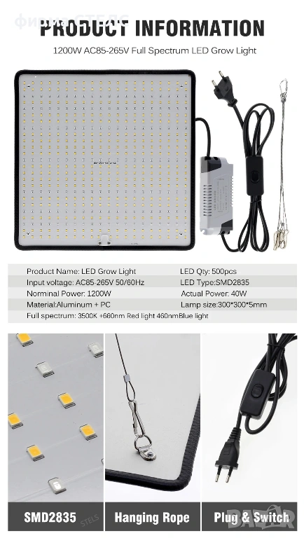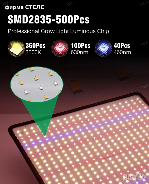Енергоспестяващата лампа за растения STELS е идеалното решение за домашно отглеждане през есенно-зимния сезон. Оборудвана с 500 LED диода, тя осигурява мощна grow led светлина, необходима за здравословното развитие на вашите култури, като същевременно консумира едва 40W реална електроенергия.