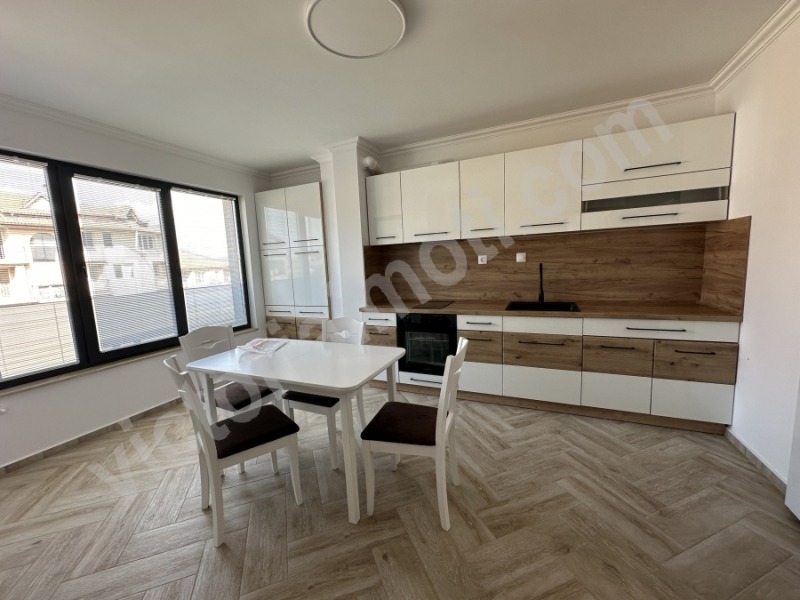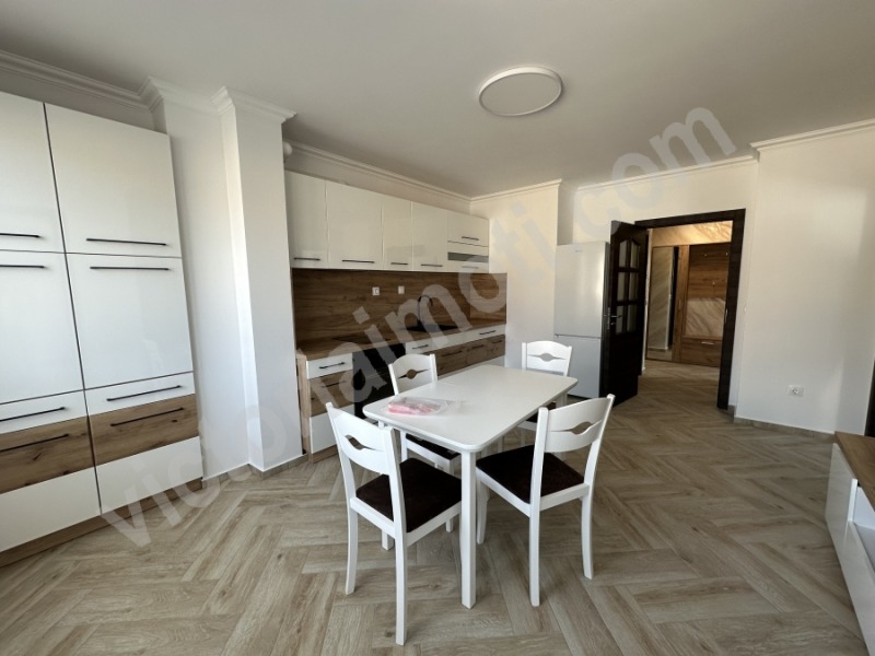 Екипът на Виктория имоти предлага на Вашето внимание прекрасен чисто нов апартамент под наем в новопостроен комплекс в началото на Зона Б. Мястото е тихо и спокойно, а жилище се намира на междинен етаж. Площта му е разпределена между г-образен коридор, кухня с трапезария, две спални, баня с тоалетна, мокро помещение и тераса. Обзаведено е с нови мебели, а като електроуреди разполага с вградена готварска печка, керамични котлони, абсорбатор, хладилник и пералня. За отопление и охлаждане във всяка стая има монтиран инверторен климатик. В наемната цена е включена таксата за поддръжка на общите части. Има възможност за допълнително наемане на ПАРКОМЯСТО. Не пропускайте да бъдете първите наематели на този хубав имот!