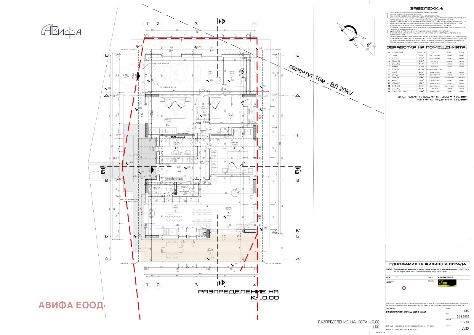 Застроена площ на сградата заедно с гаража 157.35кв.м, веранда-22.05 кв.м.,обща застроена и разгъната застроена площ -179.40кв.м., площ на парцела -732 кв.м.