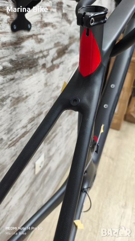 Рамката не е сглобявана, без следи от съхранение, с изключение на една транспортна забележка по боята на диагоналната тръба (снимки 11 и 18), без увреждане на карбона. Рамката е ендюрънс модел, със специфична дамска геометрия с по-къса и ниска седалкова тръба за повече комфорт и компактна позиция. Размерът е подходящ, както за деца и юноши, така и за възрастни с по-нисък ръст.