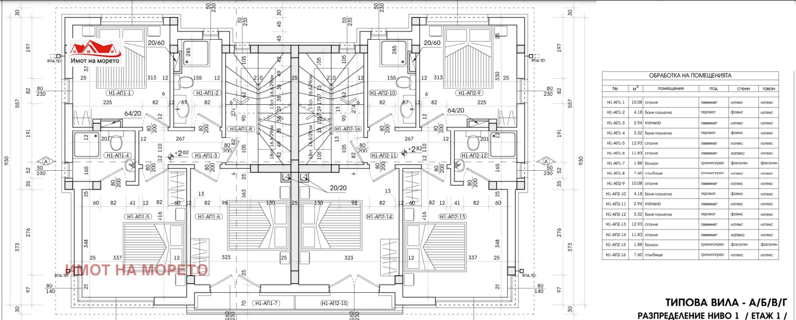 Първи ет. -три спални, едната със собствен санитарен възел и един общ за другите две спални, тераса.