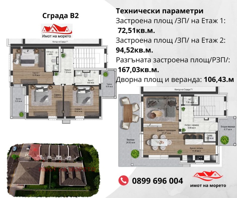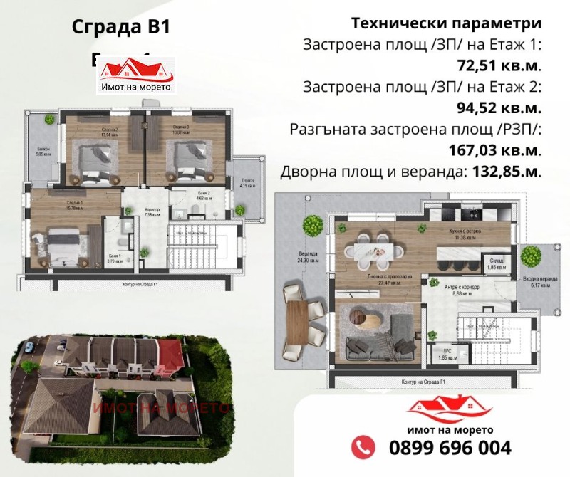 Технически параметри: Застроена площ /ЗП/ на Етаж 1: 72,51 кв.м. Застроена площ /ЗП/ на Етаж 2: 94,52 кв.м. Разгъната застроена площ /РЗП/: 167,03 кв.м. Дворна площ и веранда: 132,85.м. - 340000евро.