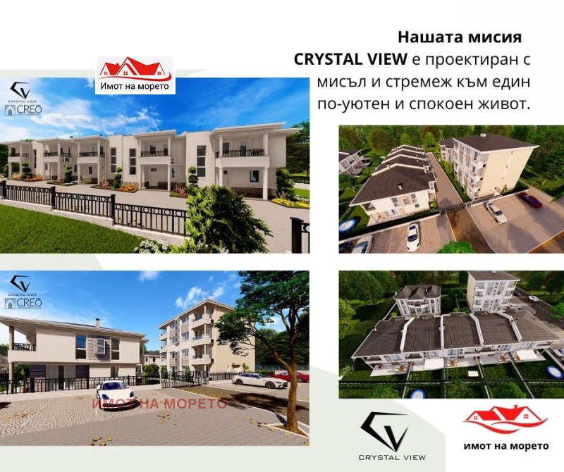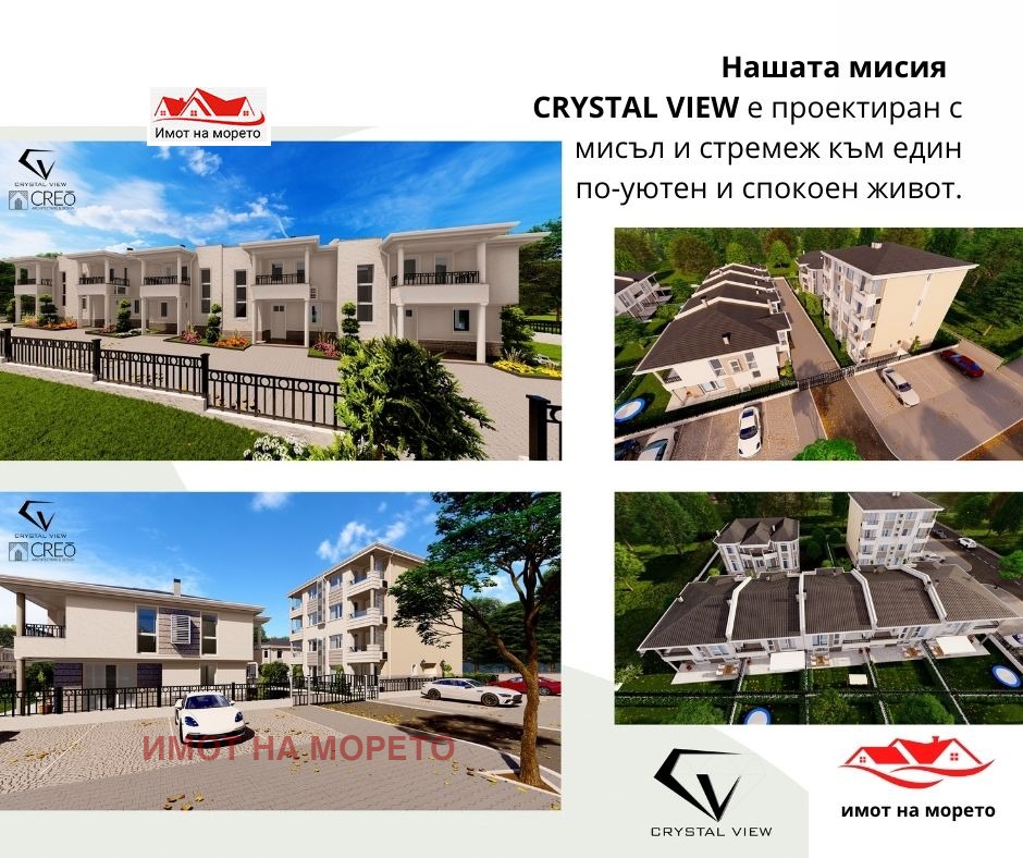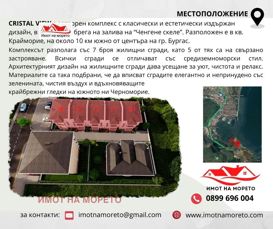 CRISTAL VIEW е затворен комплекс с класически и естетически издържан дизайн, в близост до брега на залива на Ченгене скеле . Разположен е в кв. Крайморие, на около 10 км южно от центъра на гр. Бургас.