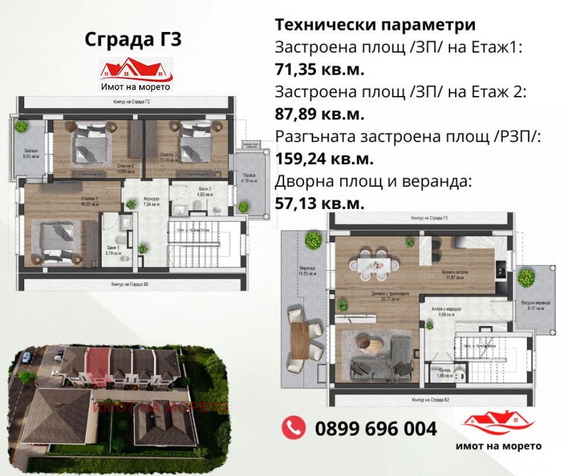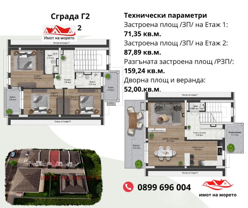 Технически параметри: Застроена площ /ЗП/ на Етаж 1: 71,35 кв.м. Застроена площ /ЗП/ на Етаж 2: 87,89 кв.м. Разгъната застроена площ /РЗП/: 159,24 кв.м. Дворна площ и веранда: 46,84.м. - 320000евро.