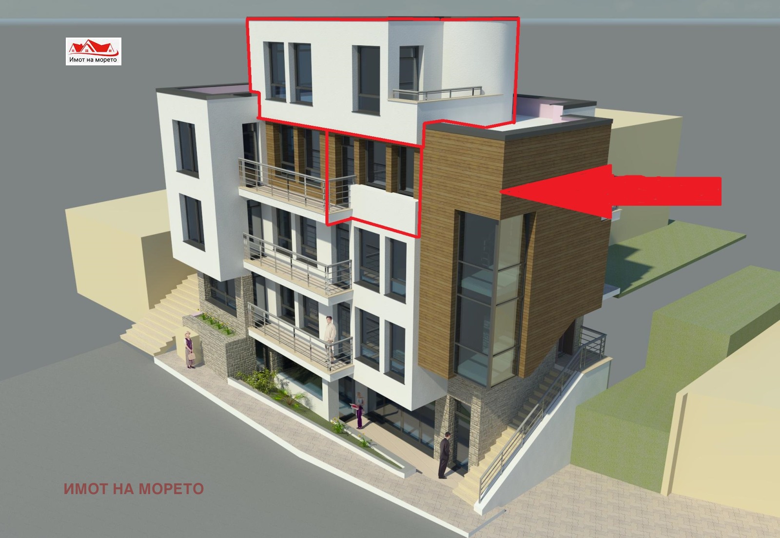 Жилището е с площ 98, 74 кв.м + 58 кв.м тераси, разположено на две нива 4 и 5 етаж, със следното разпределение: първо ниво - дневна с кухня и трапезария, санитарен възел и тераса с гледка море. Второ ниво две спални, санитарен възел, две тераси с гледка към морето.