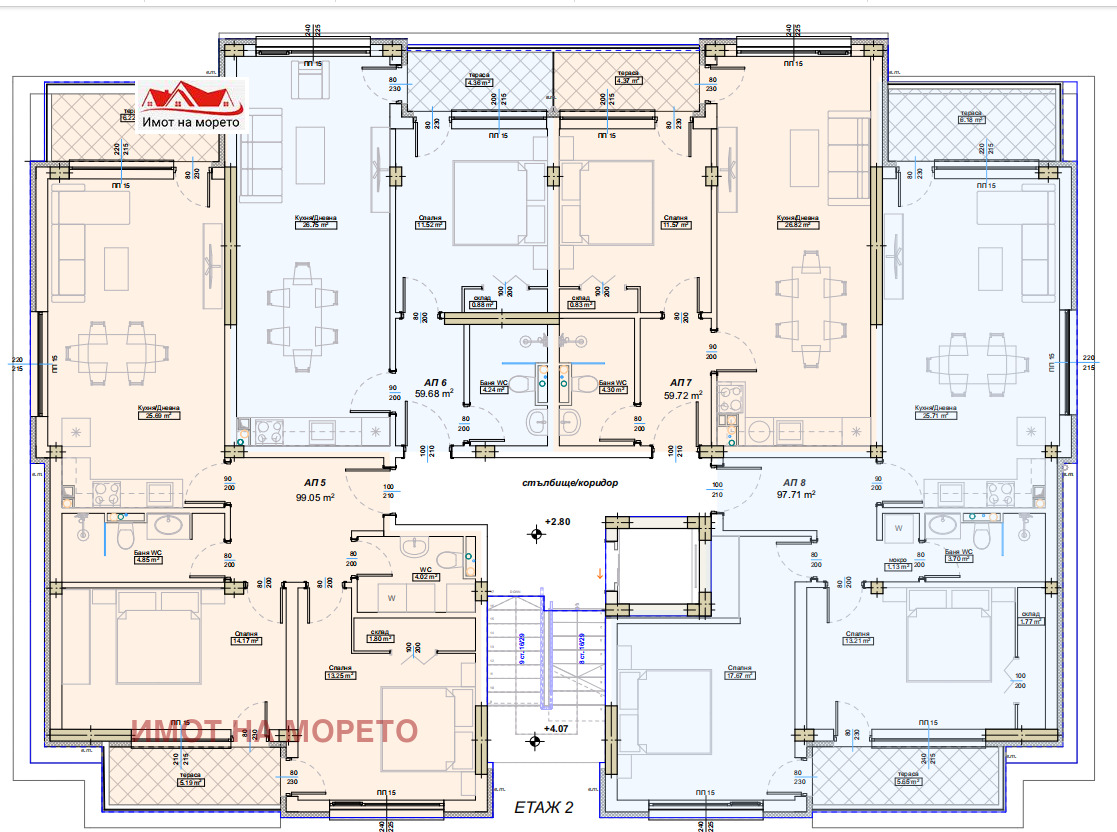 Жилището е с площ 109,2 кв.м, разположено на етаж 2, със следното разпределение: входно антре, дневна с кухненски бокс, две спални, два санитарни възела, две тераси с изглед към морето.