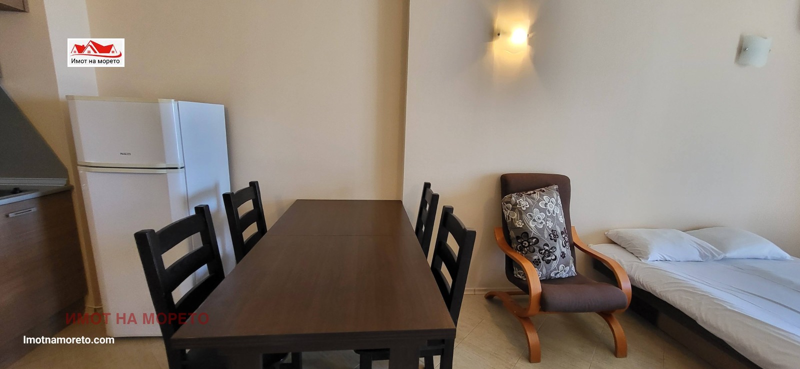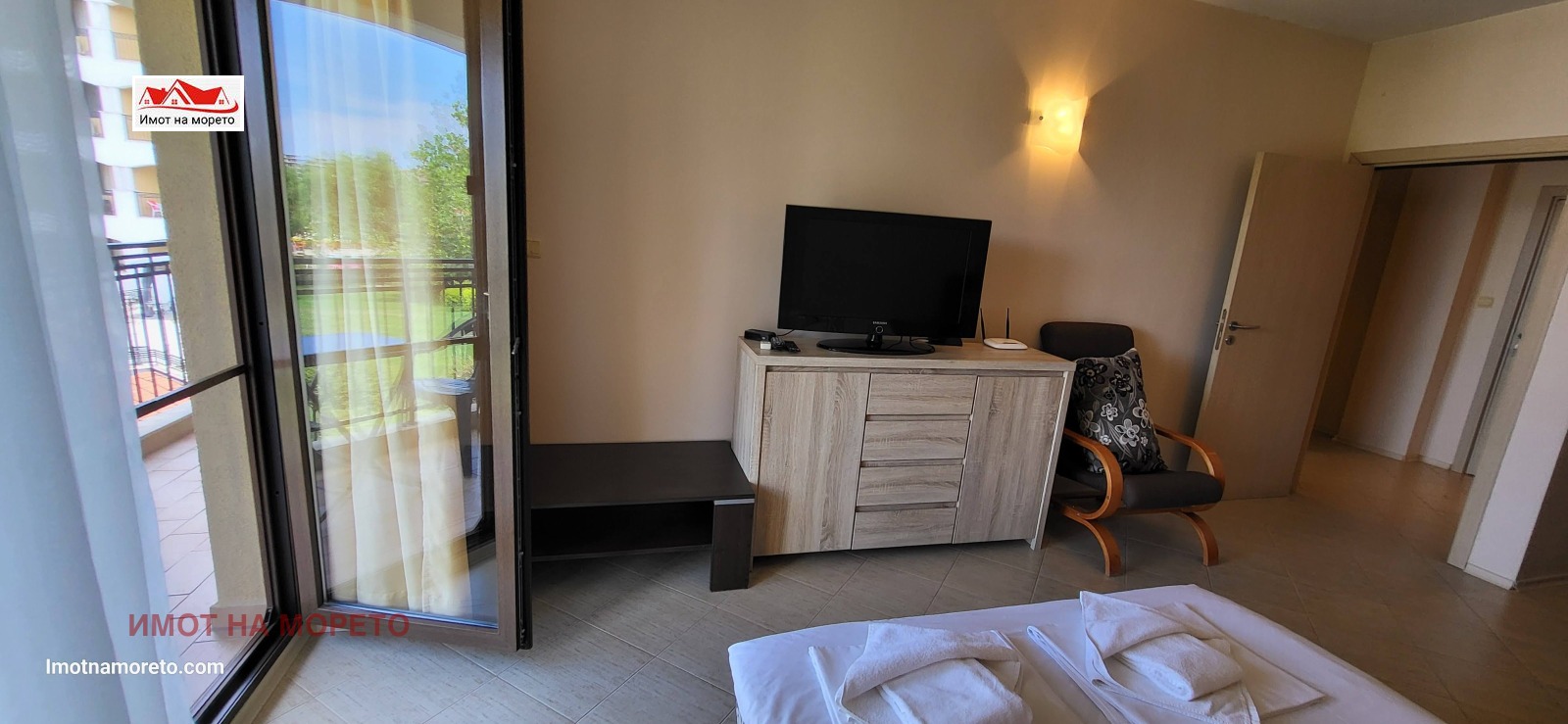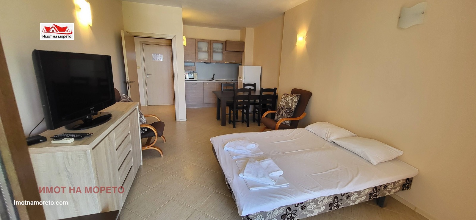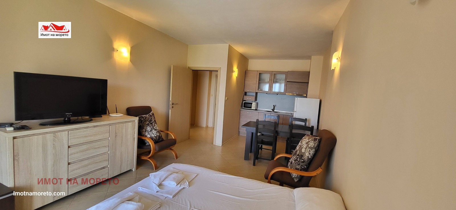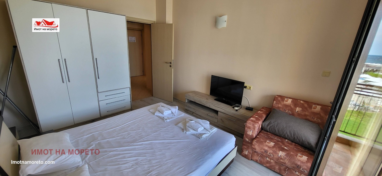 Жилището се състои от входно антре, дневна с кухненски бокс, спалня, бяна с тоалетна и тераса, от която се открива фронтална гледка към морето! Апартаментът разполага с климатици, телевизор, кът за сядане, трапезария с маса и добре оборудван кухненски бокс, баня с бойлер и душ-кабина.