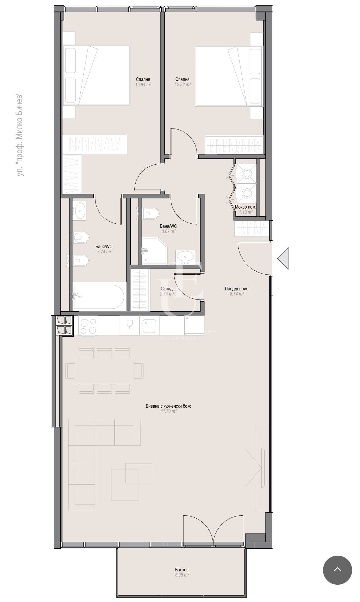 Апартаментът е разположен на 10 ти етаж, от където се разкриват невероятни гледки към вътрешния двор на комплекса. Жилището е с обща площ от 156 кв.м. и предлага функционално разпределение, което включва две спални, дневна с трапезария и кухненски бокс, две бани с тоалетна, входно преддверие, тераси и складово помещение.