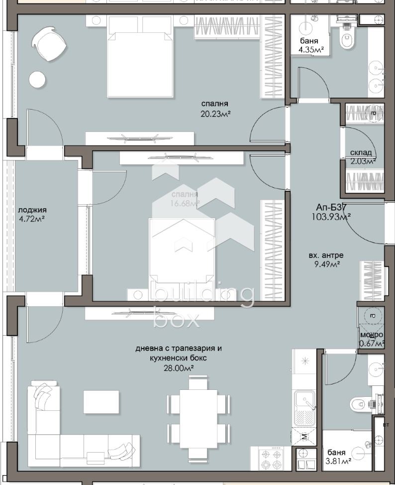 БИЛДИНГ БОКС представя сграда, която се отличава с просторни жилища с перфектно разпределение, нисък процент общи части и високо качество на строителството, изпълнено от опитни професионалисти, които осигуряват сигурност и комфорт за бъдещите обитатели.