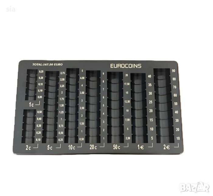 Професионален монетник за евро – практична монетна касета за сортиране и подреждане на евро монети по номинал. Подходящ е за работа на каса и улеснява бързото връщане на ресто, като поддържа монетите организирани и винаги под ръка.
