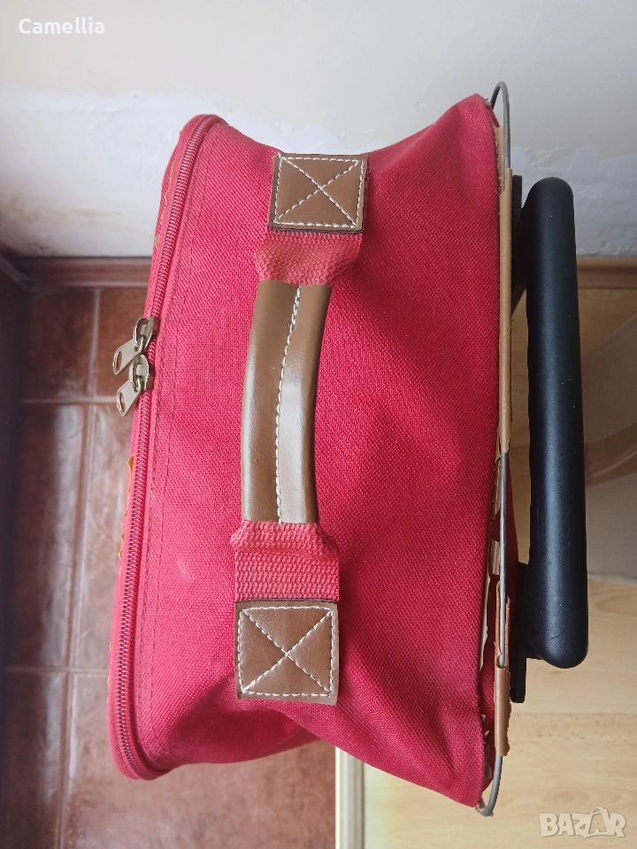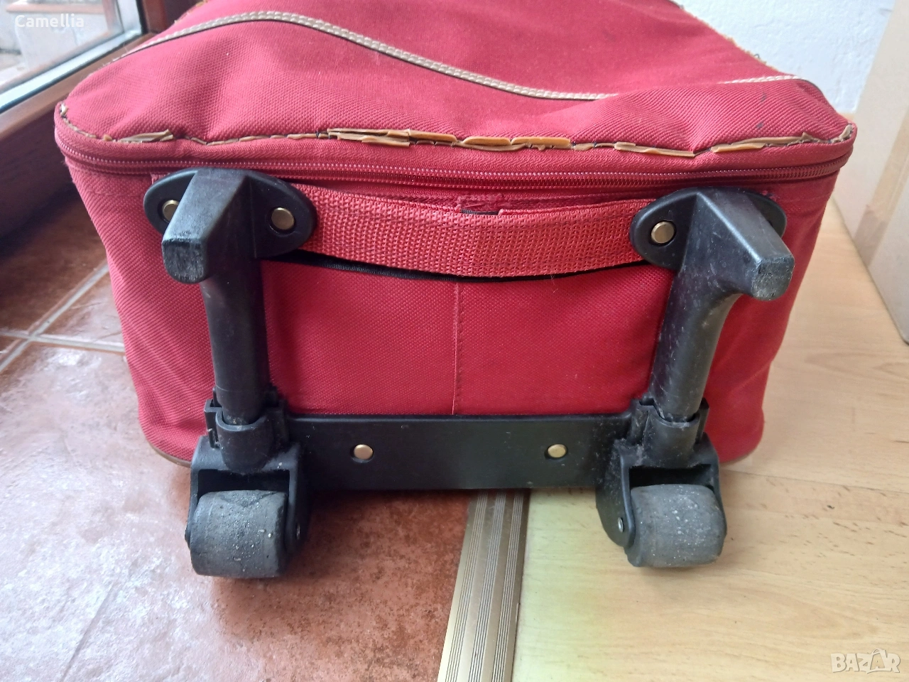 Малък червен куфар на колелца, използван. Телескопична дръжка, 2 колелца и двоен цип.