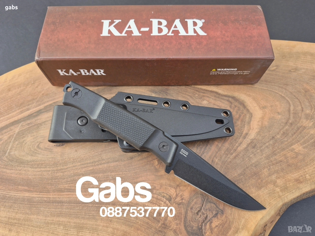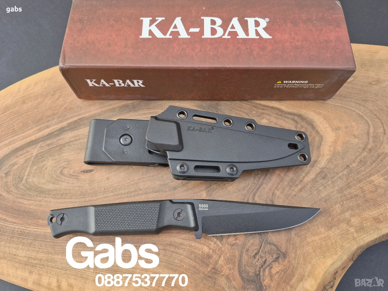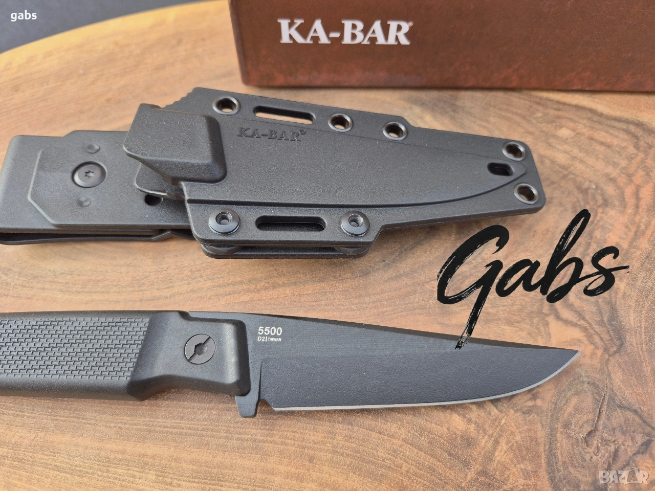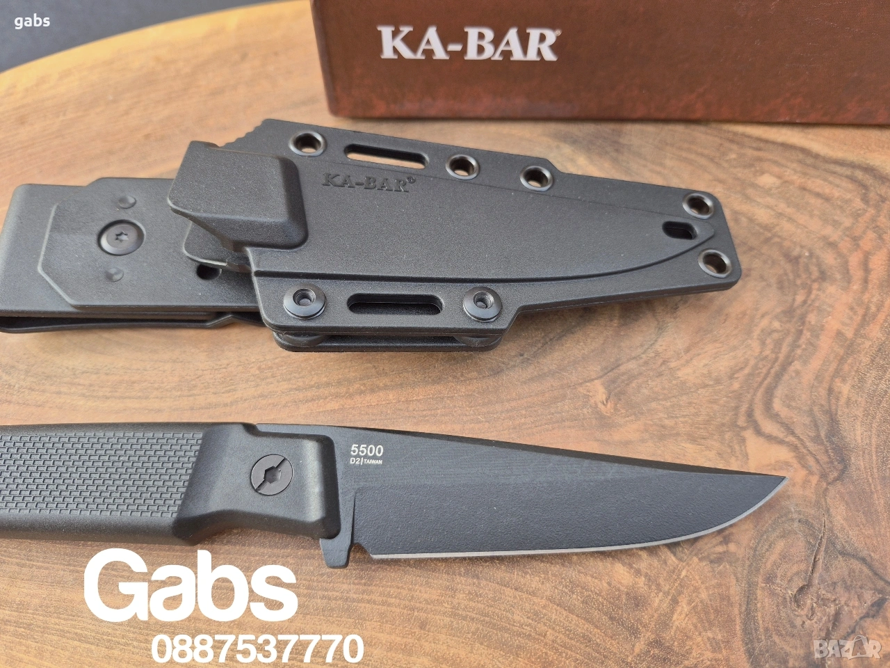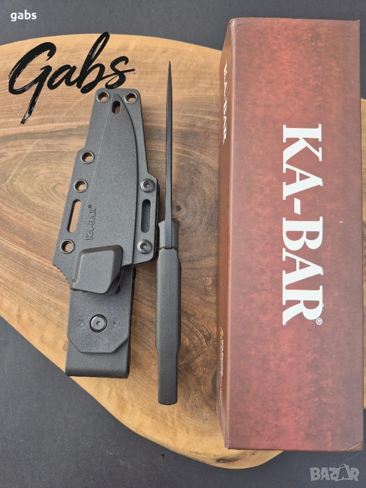 нож KA BAR 5500,с черно острие от стомана D2 и кания с щипка за колан.Дръжка от найлон,подсилен с фибростъкло,материал характеризиращ се с твърдост и висока устойчивост на удар.В допълнение има и отвор за връзка.