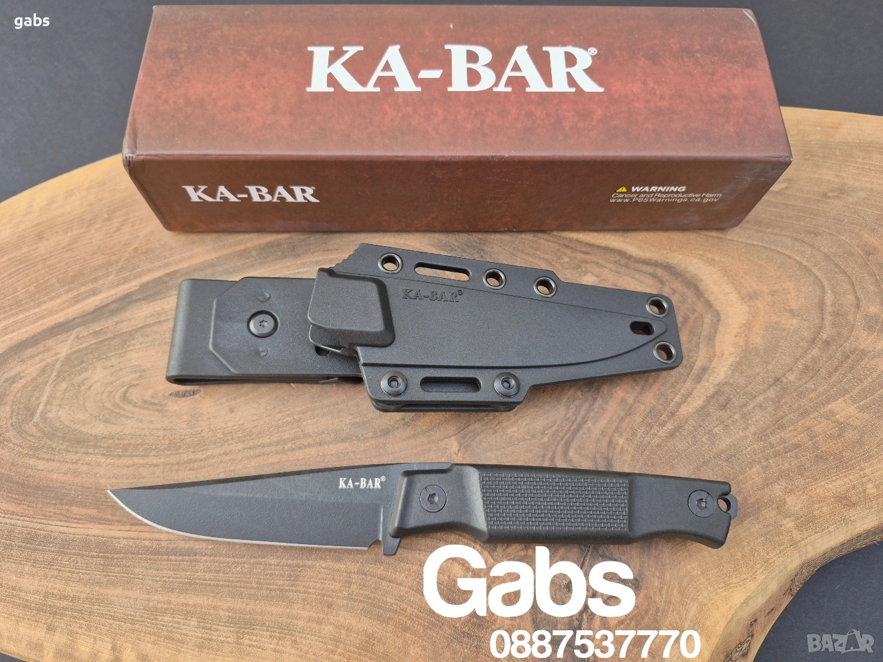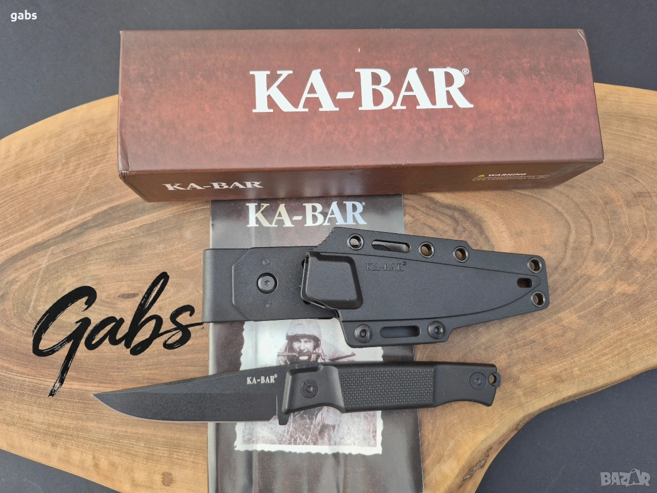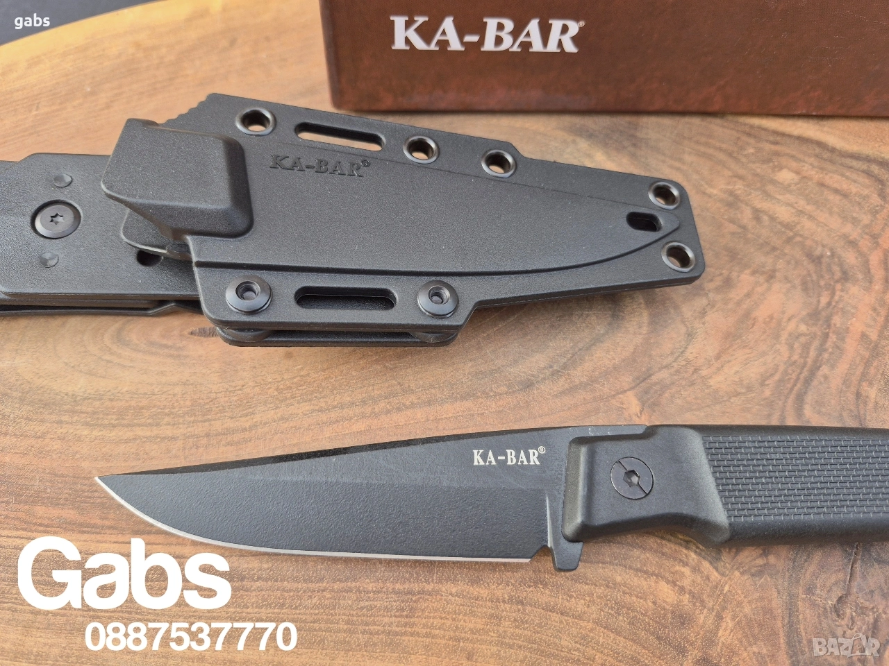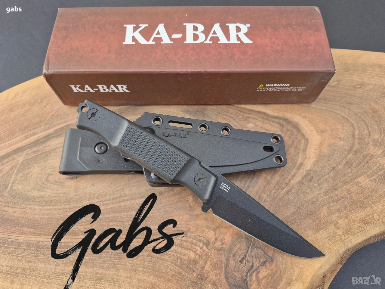 нож KA BAR 5500,с черно острие от стомана D2 и кания с щипка за колан.Дръжка от найлон,подсилен с фибростъкло,материал характеризиращ се с твърдост и висока устойчивост на удар.В допълнение има и отвор за връзка.