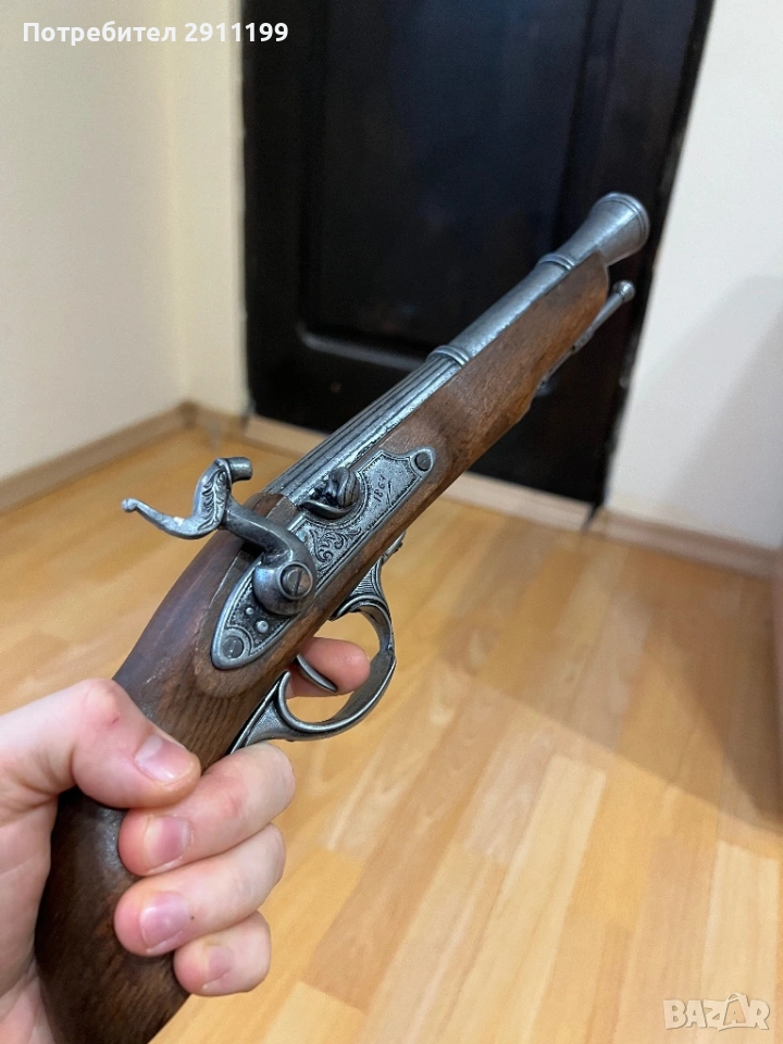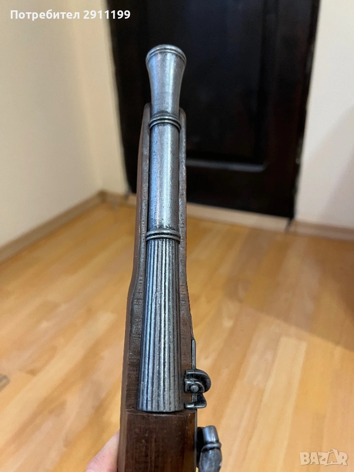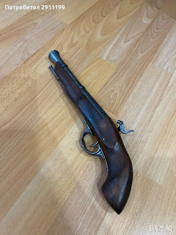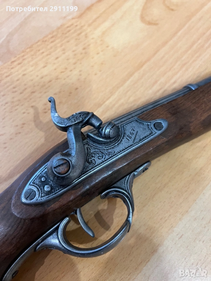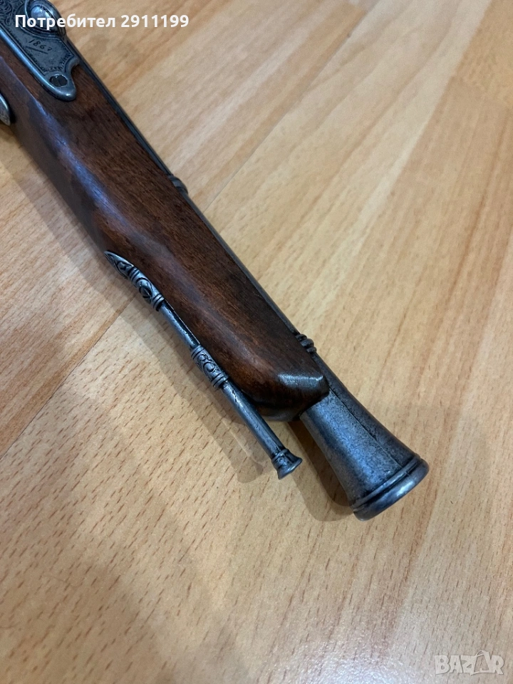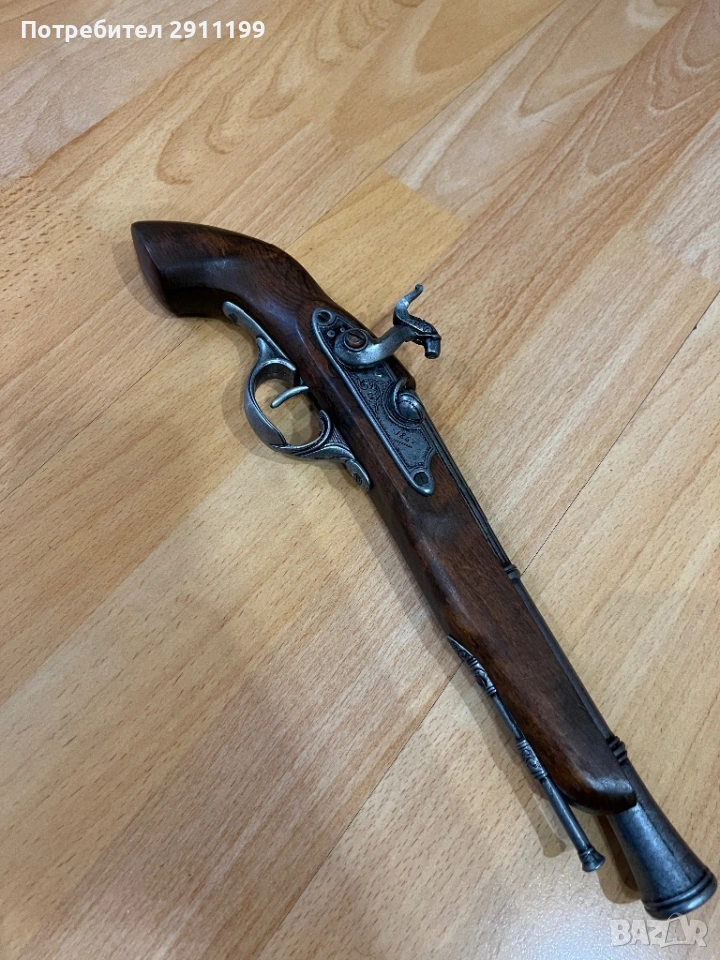 и дърво. Дълъг е 37 см. Механизма му работи.