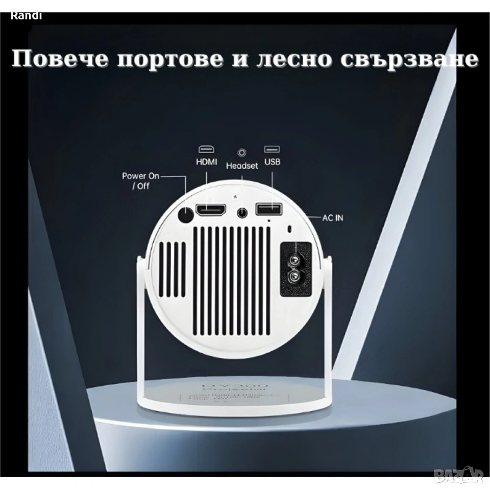 Интелигентен видео проектор 4K с два геймпада, дистанционно управление, Android TV 11 и WiFi 6 Резолюция: Поддържа 4K декодиране и Ultra HD съдържание Яркост: Около 280 ANSI лумена Операционна система: Android TV 11.0 с предварително инсталирани приложения Свързаност: WiFi 6 (2.4/5 GHz), Bluetooth 5.0, HDMI, USB, 3.5 мм аудио Корекция на изображение: AutoKeystone 4D + ръчен фокус и ZOOM Гейминг: Включени 2 безжични контролера Аудио: Вграден високоговорител + аудио жак за външни колони Физически: Алуминиева стойка 270°; размери прибл. 17 x 13 см Гаранция: 12 месеца