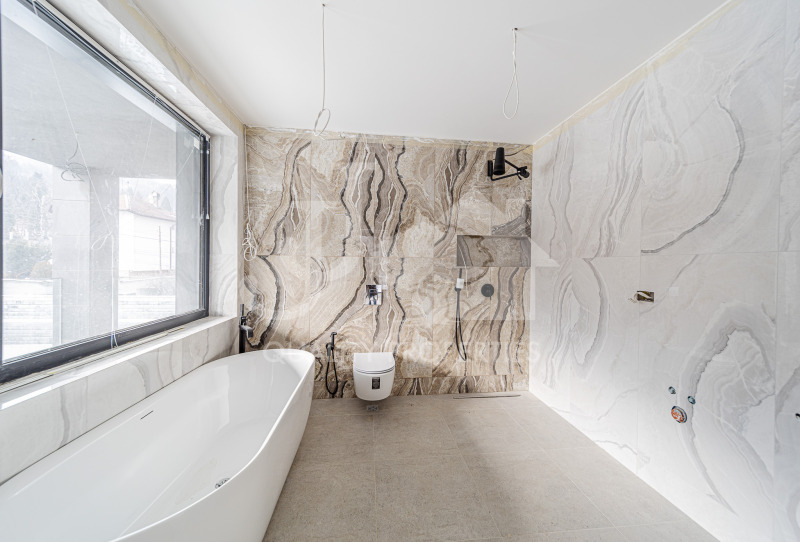 С внушителна разгъната застроена площ от 820 кв.м., разпределена на четири нива, и просторен двор от 1 декар, тази резиденция предлага усещане за простор, уединение и престиж. Къщата е изградена с най-висок клас материали, подчинени на модерна архитектурна визия: окачена фасада с екструдиран испански гранитогрес, испански гранитогрес във всички помещения, италиански санитарен фаянс във всичките 7 бани, всички врати в къщата са Hörmann със скрити панти, хидравличен асансьор, обслужващ всички нива. Разпределение: СУТЕРЕННО НИВО SPA & RELAX - зона за джакузи, парна баня и сауна, масажно помещение, фитнес, игрална зала с мокър бар, санитарни възли, изградена професионална вентилационна система; ПЪРВО НИВО представително входно предверие, впечатляващ хол 96 кв.м.+ кухня 35 кв.м. с директен излаз към двора, кабинет/офис, сервизно помещение, гараж за три автомобила; ВТОРО НИВО три спални, всяка със собствена баня с тоалетна, самостоятелни гардеробни към всяка спалня; ТРЕТО НИВО просторна дневна, спалня със собствена баня, уникална 360-градусова панорамна тераса със спираща дъха гледка към Витоша и целия град. Отопление и охлаждане - имотът е проектиран с мисъл за бъдещето: водно подово отопление, мулти-сплит система Mitsubishi за охлаждане и отопление, камина на дърва за уют и атмосфера, подготовка за газ или термопомпа, умна къща управление на ток, отопление предвидени са и фотосолари. ДВОР И ВЪНШНИ ПРОСТРАНСТВА - лятна кухня и барбекю зона, по проект има басейн, кладенец с хидрофор за поливане, миене и при необходимост за къпане, КЪЩАТА Е С ЦЕНТАРЛНА КАНАЛИЗАЦИЯ!!! Дренажна система и яма, 6 паркоместа, включително троен гараж, зарядна станция за електромобили.