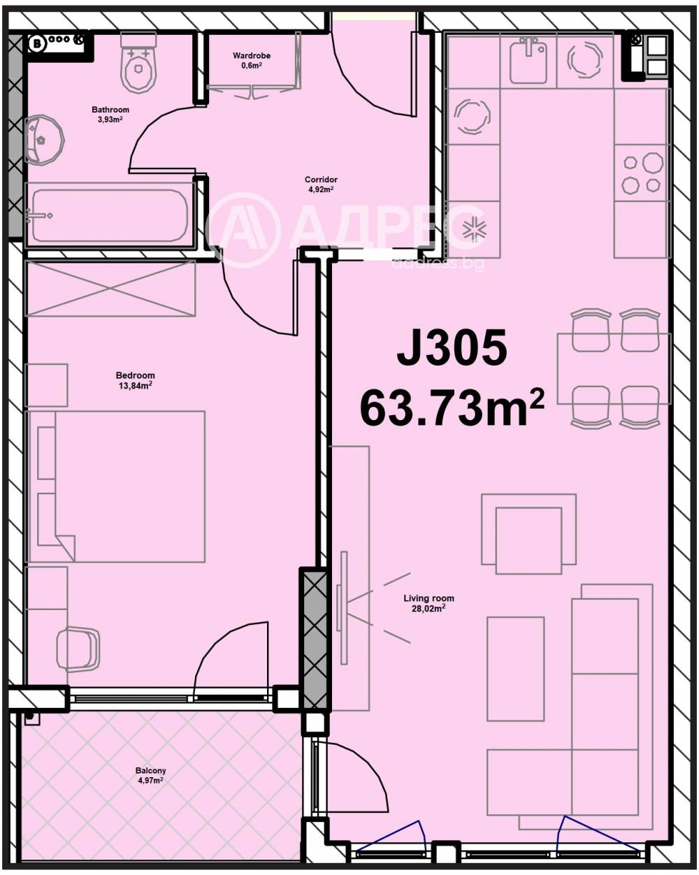 Двустаен апартамент на етаж ЧЕТВЪРТИ с изложение И. Жилището е със ЗП-63,73м2 и РЗП-75,22м2: антре, дневна с кухненски бокс и трапезария, спалня, баня с тоалетна, склад/мокро и балкон.