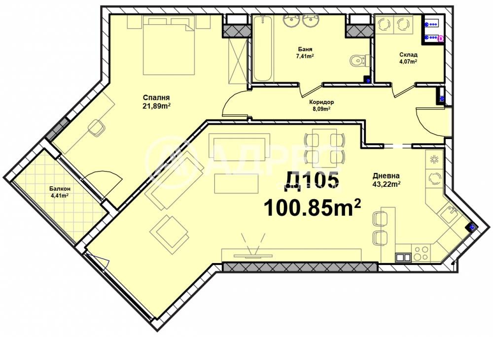 Огромен двустаен апартамент със застроена площ от 100.85 кв.м. Разположен е на втори етаж. Състои се от: антре, дневна с кухненски бокс и трапезария 43.22 кв.м., спалня 21.89 кв.м., баня с тоалетна, склад и балкон.