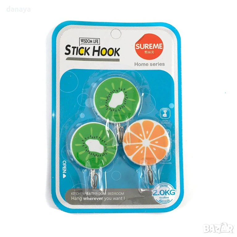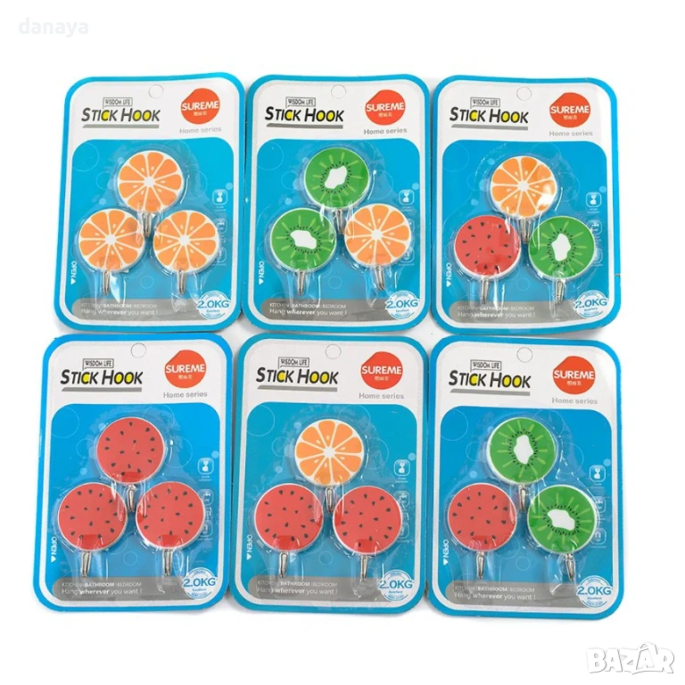 Самозалепващи закачалки с дизайн плодове – свежо и практично решение за организация в кухнята и банята без пробиване. Цветният плодов дизайн внася настроение, а компактният размер ги прави удобни дори за малки пространства.
