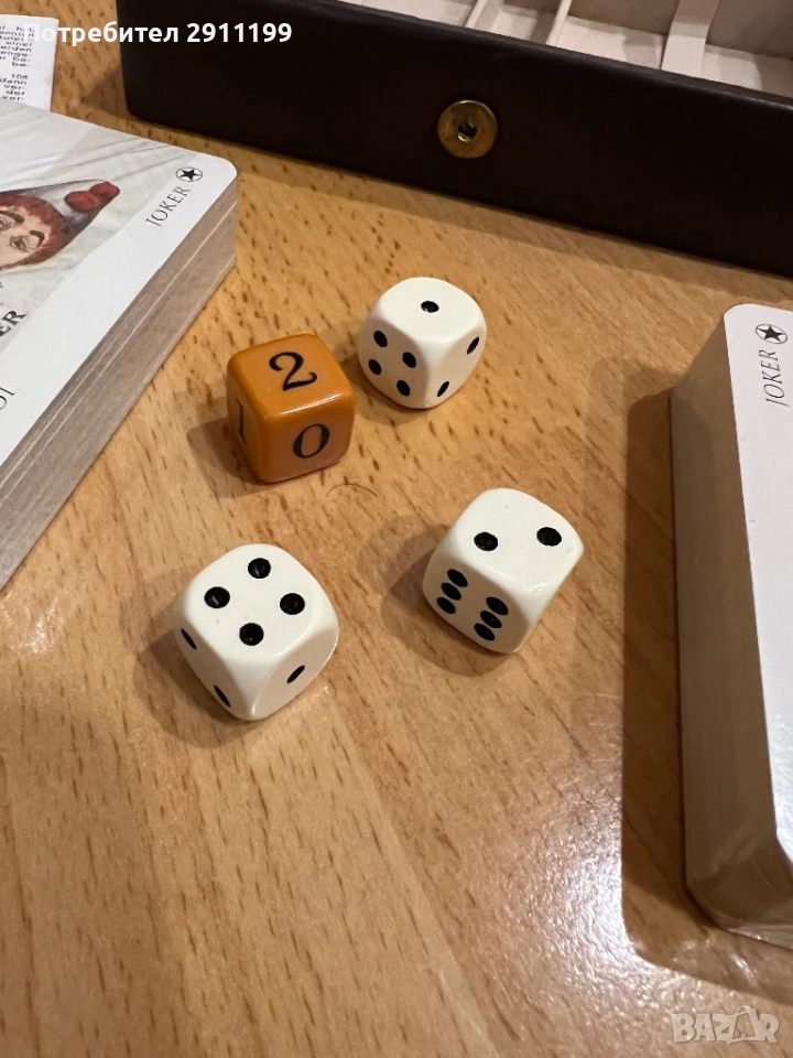 две тестета карти за игра и зарове. В