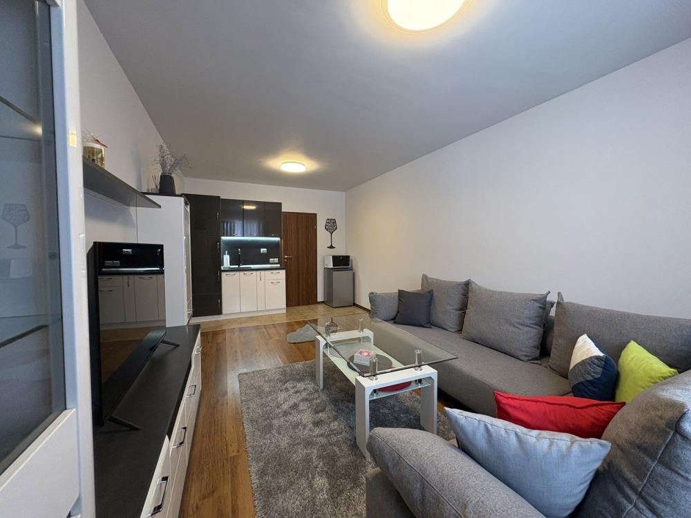 Всекидневната е обзаведена с нова мека мебел, холна маса, тв. шкаф и кухненски кът.