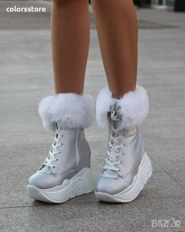 Боти на платформа - сребриста кожа с бяло ходило - BPH1