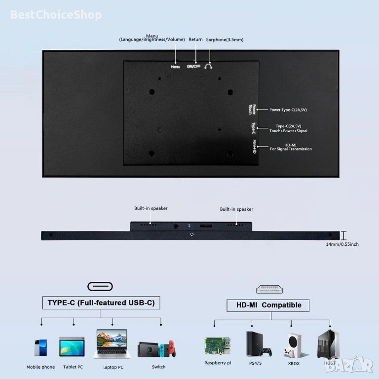- Гъвкава свързаност: Поддържа HDMI и USB C предаване на сигнал, съвместим с широка гама от устройства, включително компютри, лаптопи, игрови конзоли и други. (Забележка: за предаване на USB C сигнал, вашето устройство трябва да поддържа пълнофункционален USB C.)