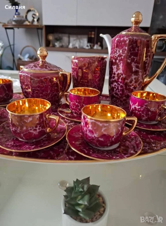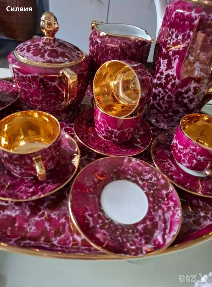 🥀Декорацията е истински шедьовър – дълбок тъмно-розов фон с мраморен ефект, комбиниран с богати позлатени акценти и вътрешност на чашките в изцяло огледално злато. Това придава на сервиза неповторима елегантност и аристократична осанка.