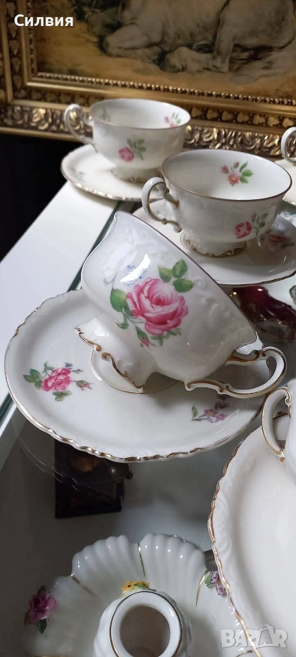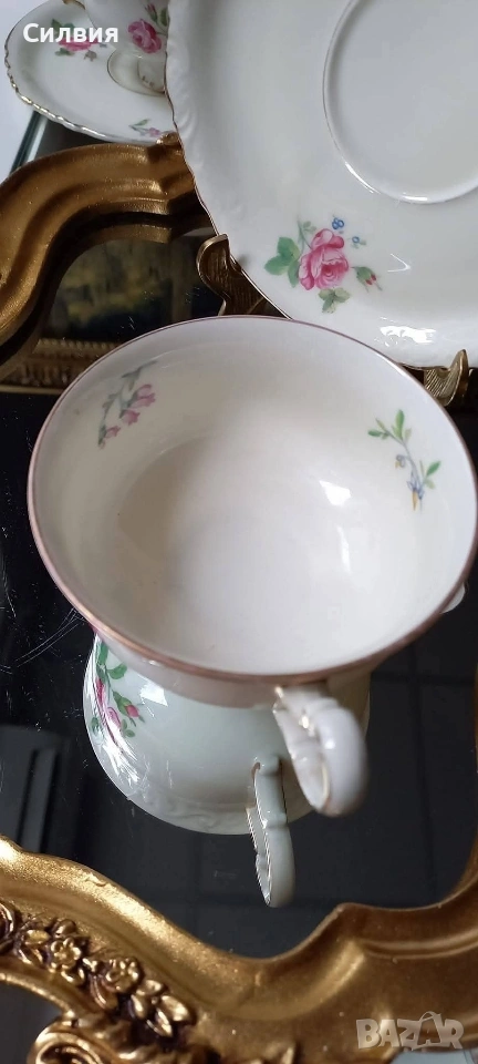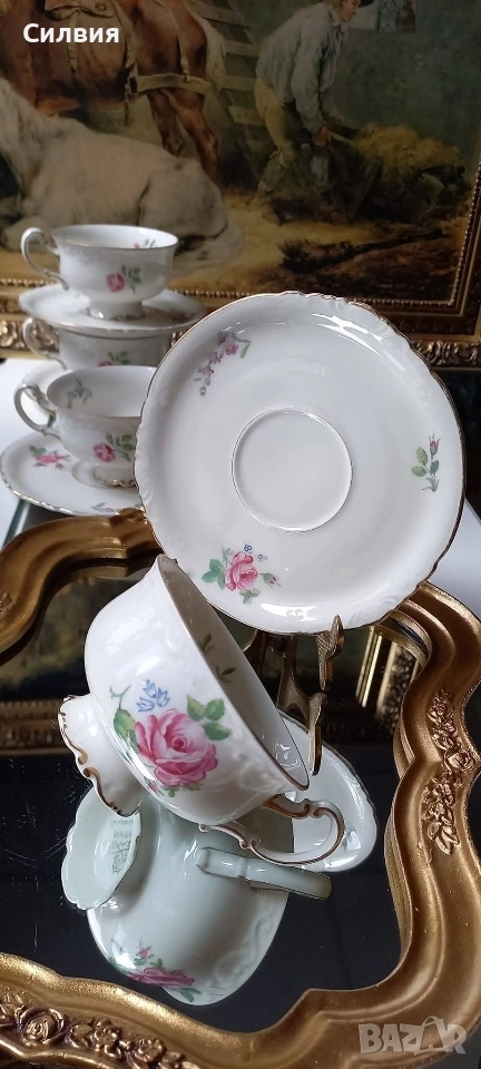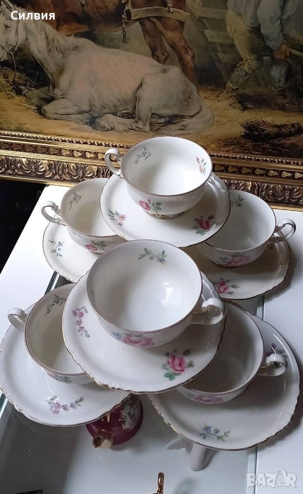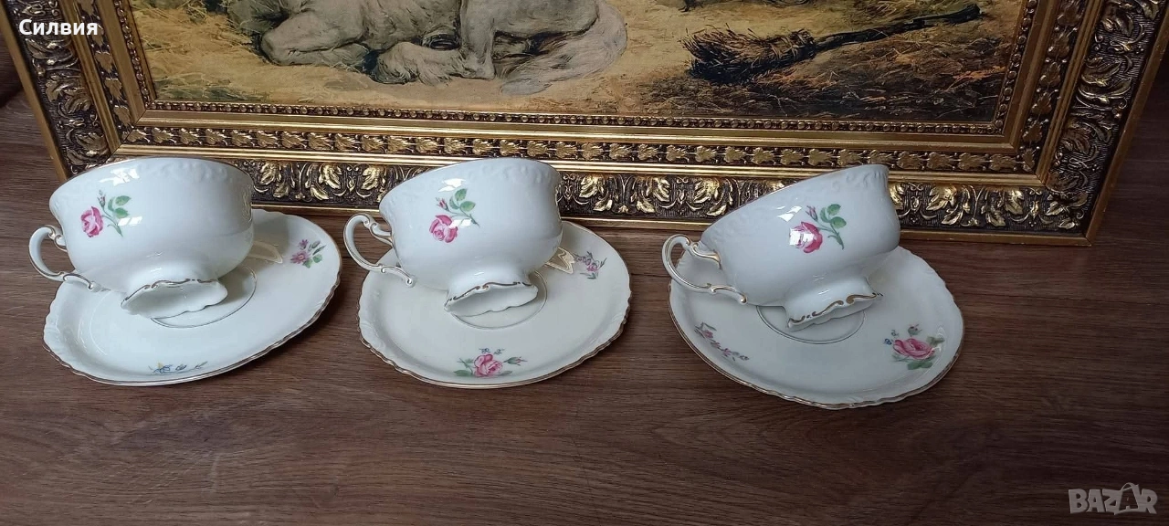 Старинен костен порцелан Königl pr. Tettau Bavaria. ~1930г. Ръчно рисуван декор. ⚘️6 чаши с вместимост 200мл. ⚘️6 чинийки с диаметър 14,8см. Млечно бяло или слонова кост, златен кант, стил барок. Рисувани рози отвсякъде. Фабриката е основана през 1794 г. в Тетау, Бавария, Германия, което я прави най-старата порцеланова фабрика в региона. Клеймото включва герб с буква "Т" и годината на основаване "1794". Текстът "Königl. pr. Tettau" е съкращение от "Königlich privilegierte Porzellanfabrik Tettau" (Кралска привилегирована порцеланова фабрика Тетау). Порцеланът на Tettau е високо ценен от колекционери. ❥─❥⊱🩷✿⊱╮🩷☆♪ ░L░o░V░e░❥─❥⊱🩷✿⊱╮🩷☆♪ღ