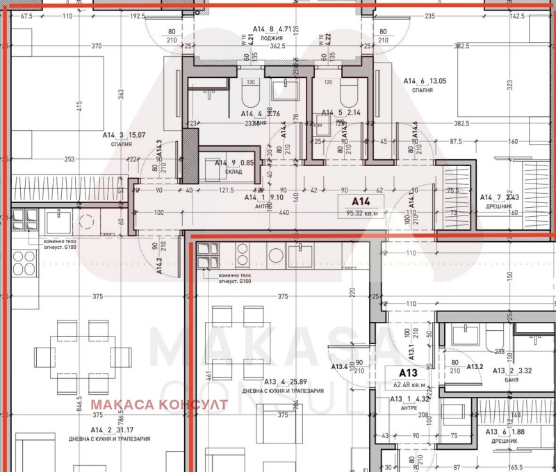 Предлаганият имот е АП. 14, находящ се на ет. 3, с РЗП 113.23 кв.м и ЗП 95.32 кв.м.