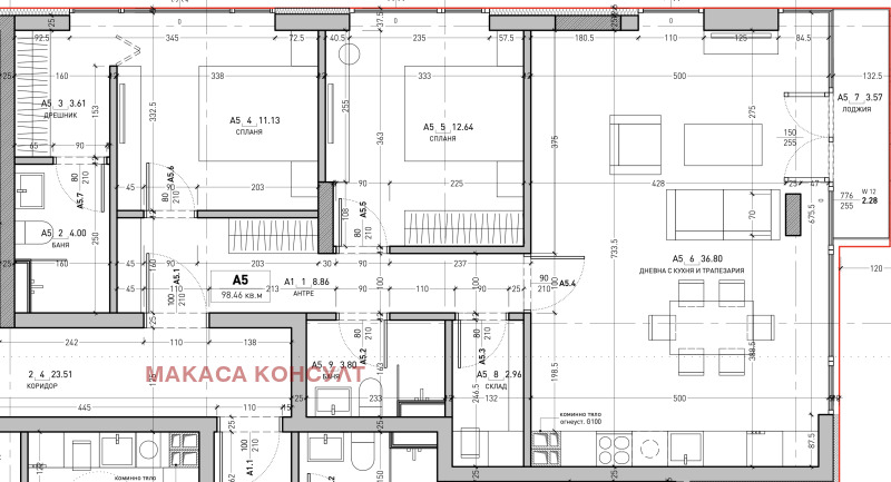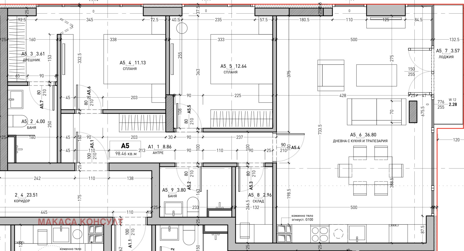 Предлаганият имот е АП. 5, находящ се на ет. 1. с РЗП 118 кв.м и ЗП 98 кв.м