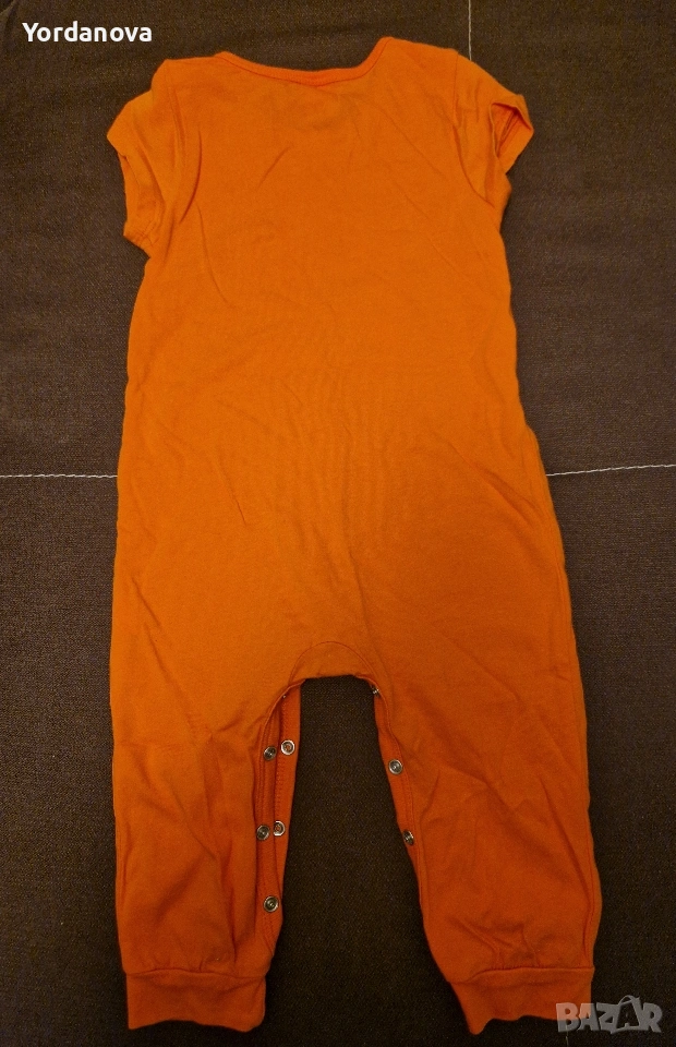 Бебешки гащеризон на LC Waikiki. Размер 74/80 (9-12 месеца). Материя - памук. Цвят - ярко оранжев. С щампа отпред. С къси ръкави, дълги крачоли и лесно закопчаване с тик-так копчета. Обличан е един единствен път.