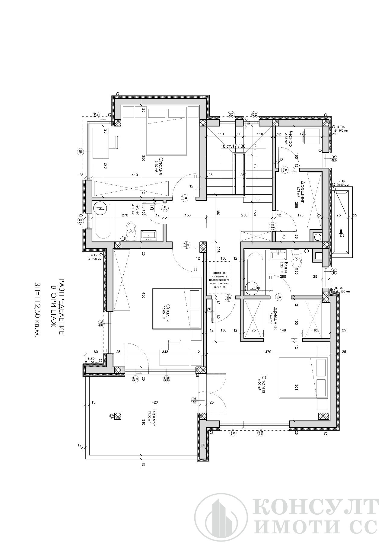 Под: полагане на топлоизолация и тръби за водно подово отопление, тръби за конвектори и лири в баните (подготовка за термопомпена инсталация).