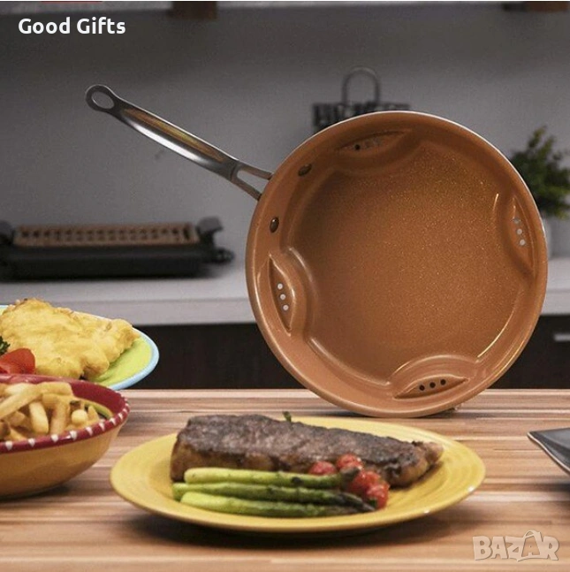 Забравете за тежките мазнини и калоричното олио! Представяме ви иновативния тиган с медно покритие, който използва революционната Air Fry технология директно върху вашия котлон. Този стилен и високотехнологичен съд позволява на храната да се готви чрез циркулация на горещ въздух, като запазва пълния вкус, аромат и сочност на продуктите.