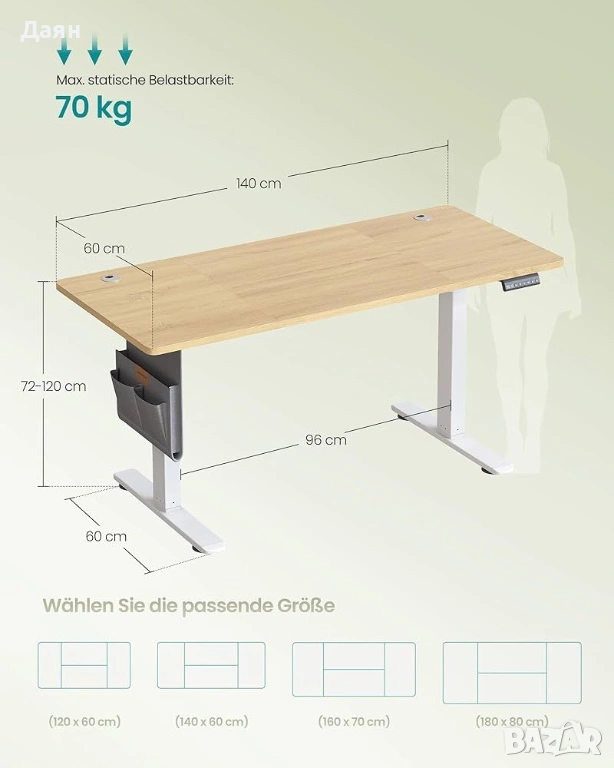 - Добра изработка: Със здравата си стоманена рамка и дебел плот, тази маса може да издържи товари до 70 кг; висококачествен мотор за плавно и тихо регулиране (< 48 dB).