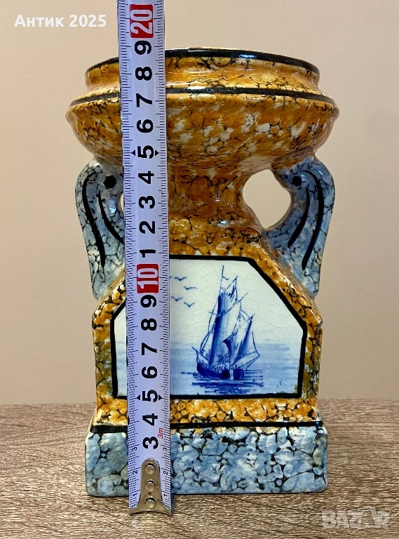 Корпусът е украсен с характерна за продукцията на Wasmuël мраморна глазура в охрови и сини оттенъци. На лицевата страна е разположен медальон с морски пейзаж — ветроходен кораб, изпълнен в синя монохромна живопис. Страничните елементи са оформени като стилизирани дръжки, които подчертават архитектурната форма на изделието.