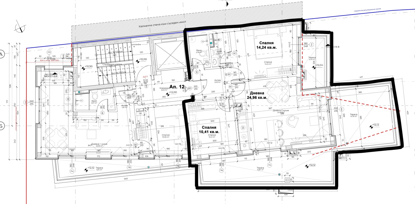 находящ се на 5-ти жилищен етаж с кота +12,00 м. - АПАРТАМЕНТ 12 от чертежите - ЗП - 118,90 кв.м.; ОЗП - 145,28 кв.м. и прилежащ склад/мазе с площ от 3,84 кв.м. ИЗЛОЖЕНИЕ на имота - ИЗТОК/ЮГ