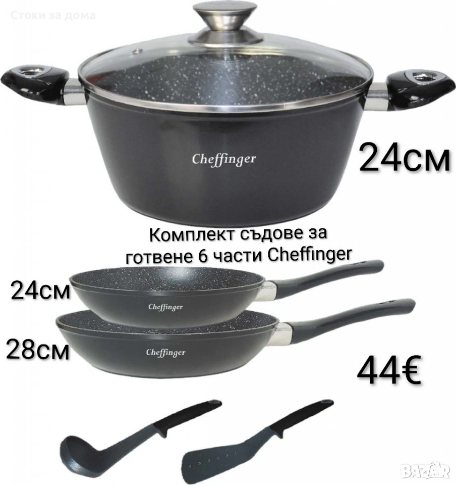 Комплект съдове за готвене 6 части Cheffinger – тенджера 24 см, тигани 24 и 28 см