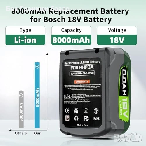 Нова Bosch 18V PBA 8.0Ah Li-Ion Батерия със защити за градински уреди