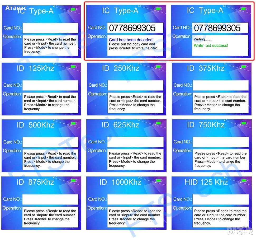 След това поставете UID чип карта (13,56 MHz записваем чип) в